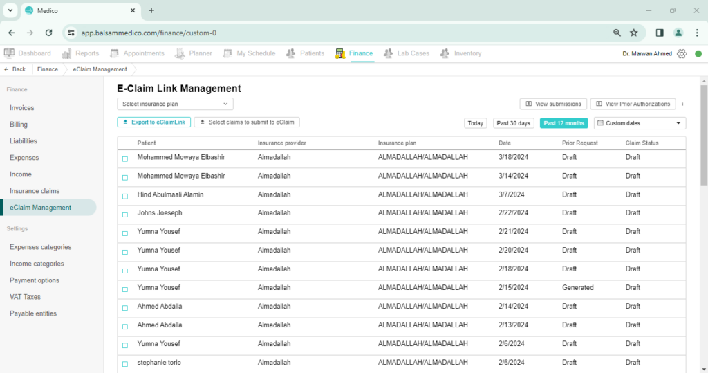 Finally, we’ve set up a whole page to manage everything eClaimLink has to do. On the page “E-Claim Link Management”, you can view the patient’s insurance data, the prior request and claim statuses. This puts the entire management in one view. If you want to view the submissions and the prior authorizations, just click the buttons on the top. You can also export to eClaimLink bulk claims of the same insurance plan, instead of sending them off one at a time. But if you still want to send off one claim by itself, we still offer that option.